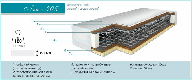 Ортопедический матраc Барро Люкс 405. Матрас двусторонний - жёсткий / среднежёсткий. Толщина матраса: 19 см.