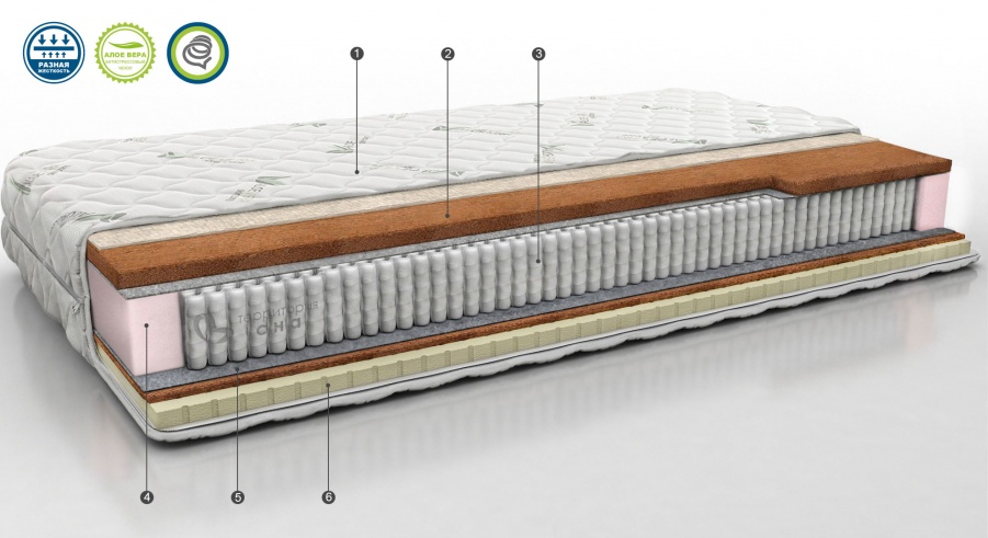 1. Чехол съемный, ткань трикотажная стеганная с добавлением экстракта Алое Вера (65% полиэстр, 30%хлопок, 5% Алое Вера)