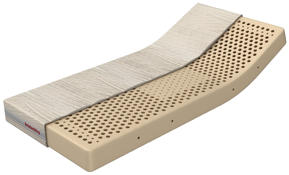 Беспружинный матрас «Изар», производства немецкой компании «Belabedding», представляет собой цельный латексный блок с отверстиями разного диаметра. Благодаря наличию съемного трикотажного стеганного с синтепоном чехла за ним легко ухаживать.